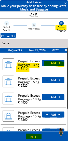 Step 6: In the Excess Baggage queue select the extra Kgs and click on " Add" and then click "Next" to make the payment.
